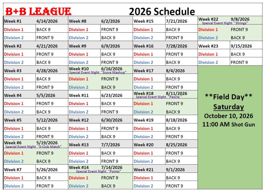 The B+B League is a social golf league that plays every Tuesday at St. Anne CC from April through September. The B+B League is a mixed league open to any and all golfers. We have monthly events nights with a unique format followed by a buffet dinner. If you would like to join The B+B League, stop by The Pro Shop at St. Anne CC and pay the dues.